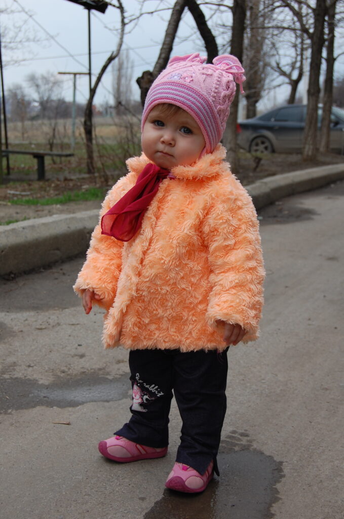 В начале работы у нас была одна фотография — снимок маленькой девочки в прогулочном образе. Тёплая куртка, вязаная шапочка, шарфик, характерная цветовая гамма и немного задумчивое выражение лица.