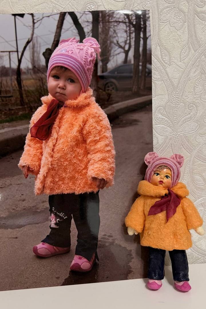 Готовая работа стала подарком для девочки по имени Николь. Она получила свою маленькую копию — куклу, которая отражает момент детства, сохранённый в фотографии и превращённый в предмет памяти.