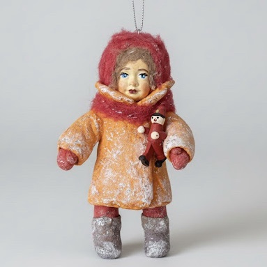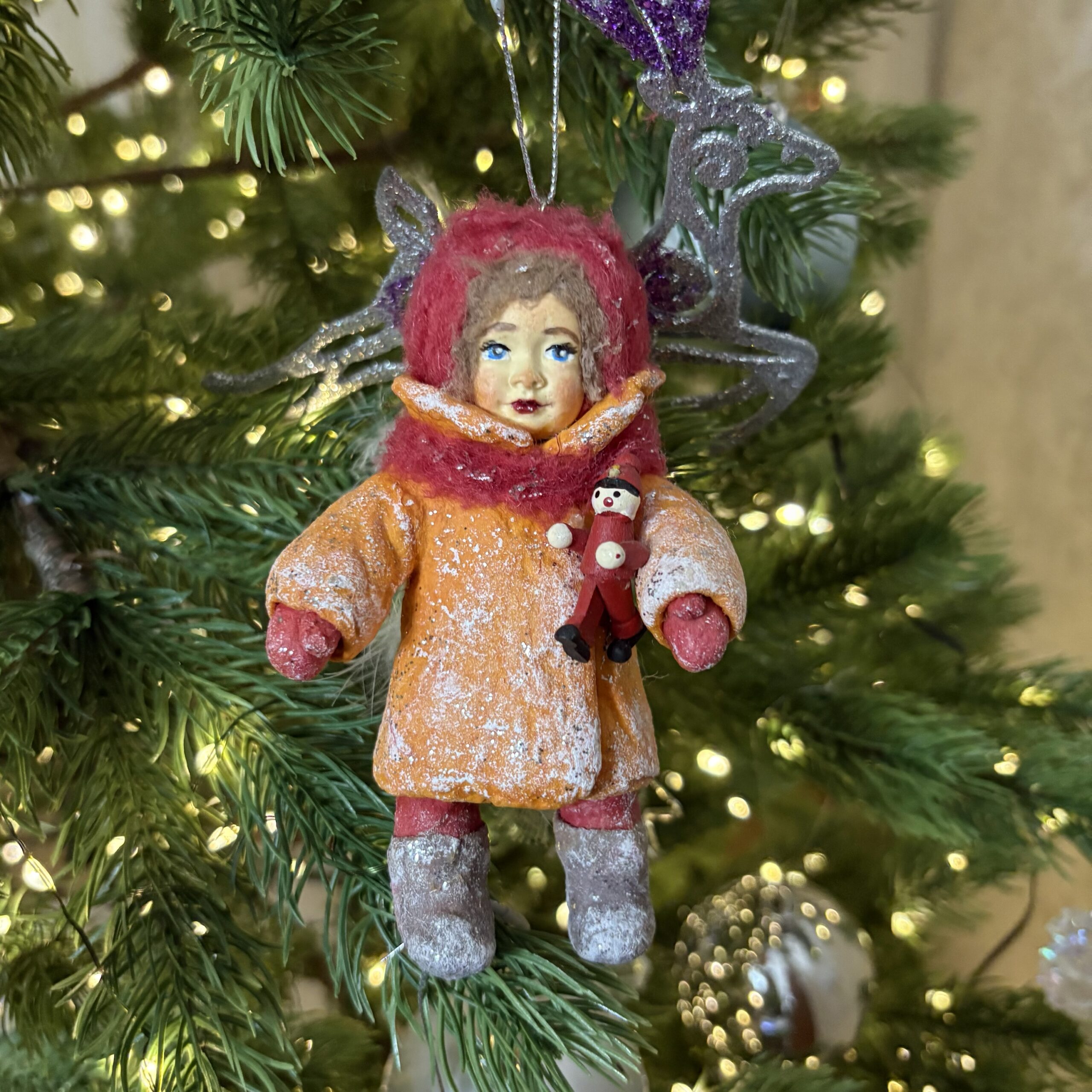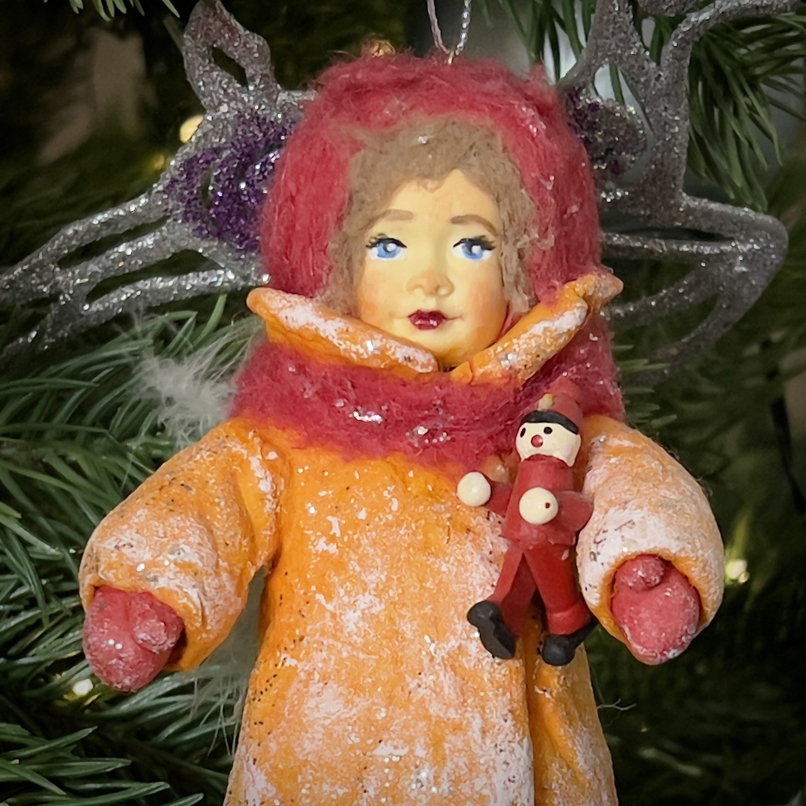 Эта кукла — именно про такие моменты. Она крепко прижимает к себе своего крошечного деревянного человечка, словно делится с ним теплом. Её оранжевое пальто, расшитое инеем, светится на фоне зимних сумерек, как маленький огонёк. Она не боится мороза, ведь у неё есть верный друг и верное предчувствие чуда.